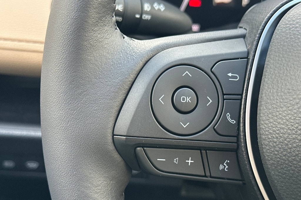 - Leather-trimmed tilt/telescopic 3-spoke steering wheel with silver accent and controls for audio, Multi-Information Display (MID, Bluetooth (R) hands-free phone, voice-command, Dynamic Radar Cruise Control (DRCC), Lane Departure Alert (LDA), and Lane Trace Assist (LTA)
