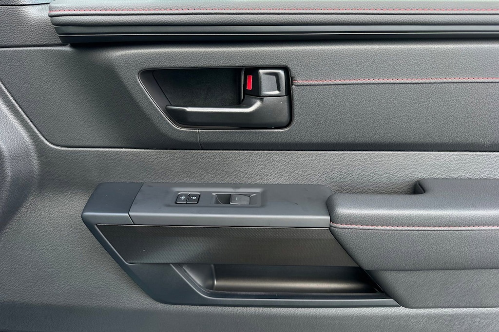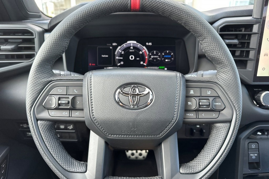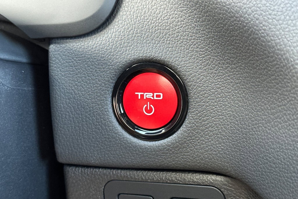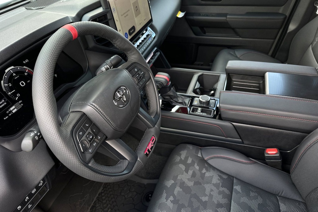 - Trd leather-wrapped manual tilt/telescopic steering wheel with trd badge, red center stripe, and phone, audio, display/infotainment, and driver assist controls.