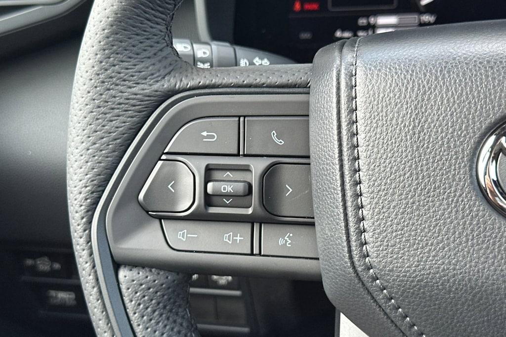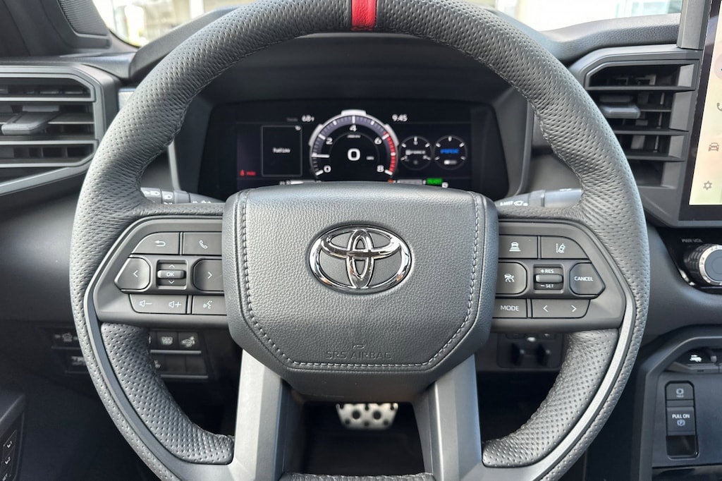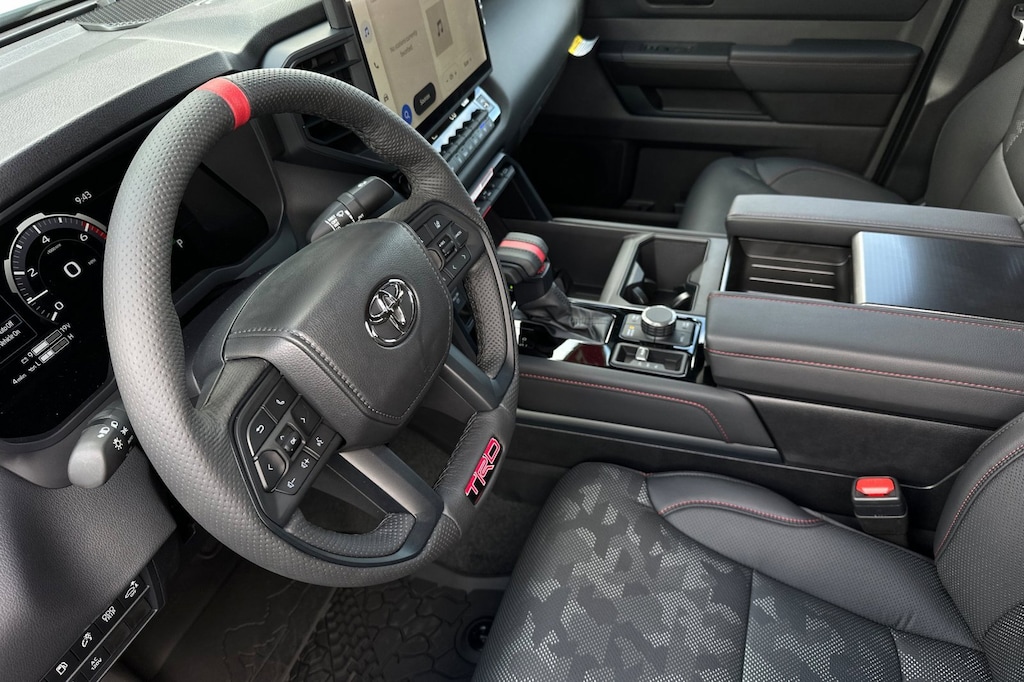- TRD leather-wrapped manual tilt/telescopic steering wheel with TRD badge, red center stripe, and phone, audio, display/infotainment, and Driver Assist controls