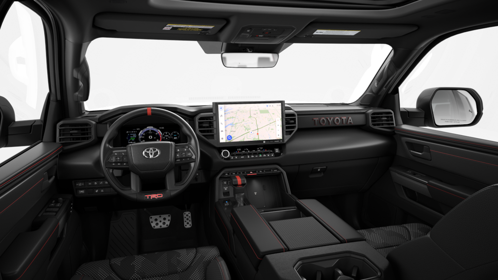 - TRD leather-wrapped manual tilt/telescopic steering wheel with TRD badge, red center stripe, and phone, audio, display/infotainment, and Driver Assist controls