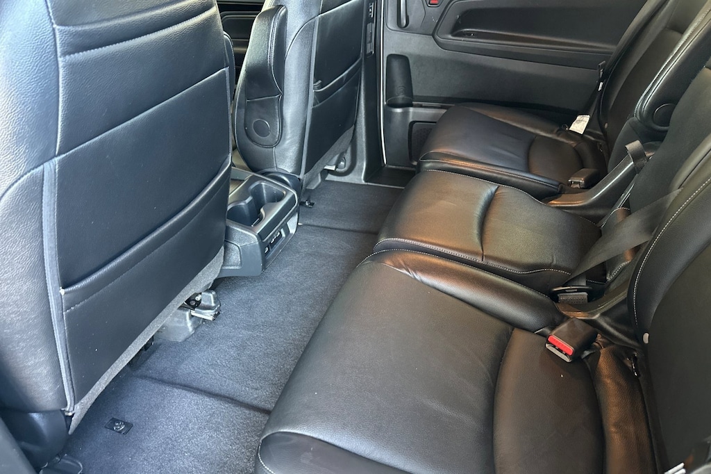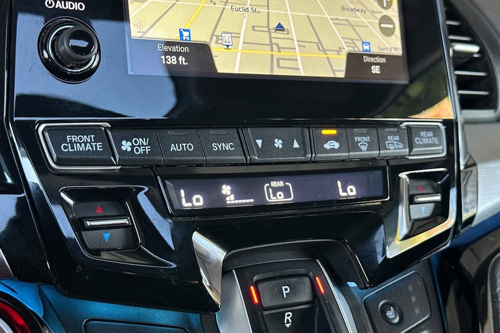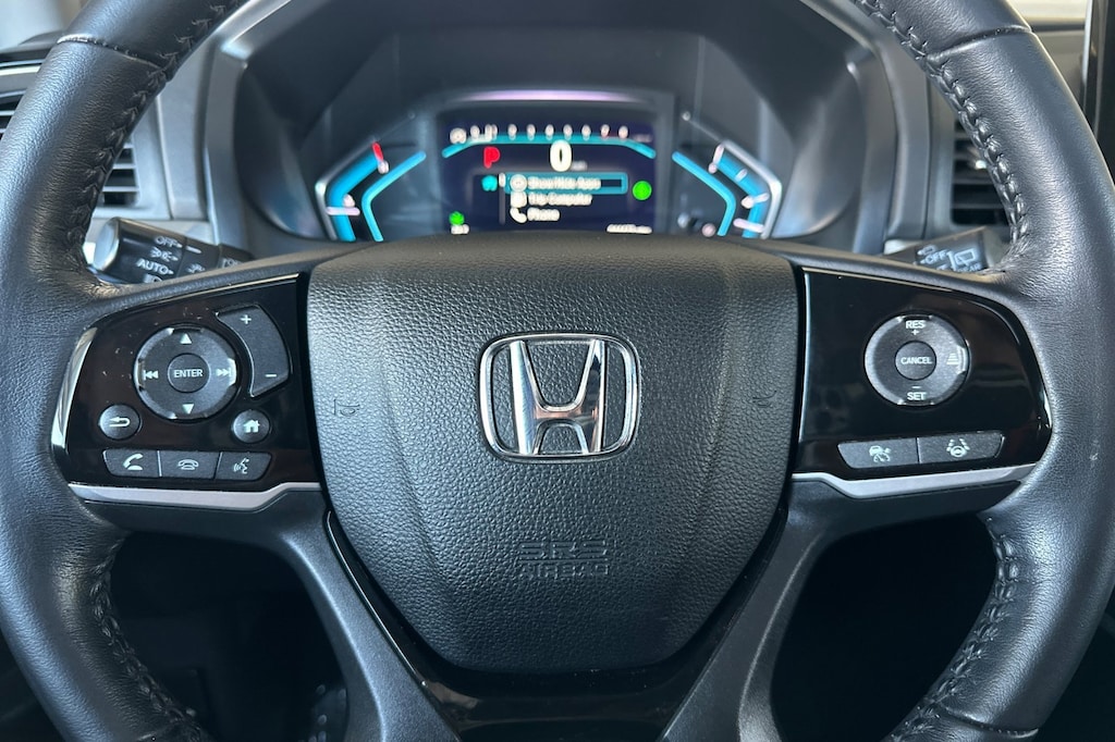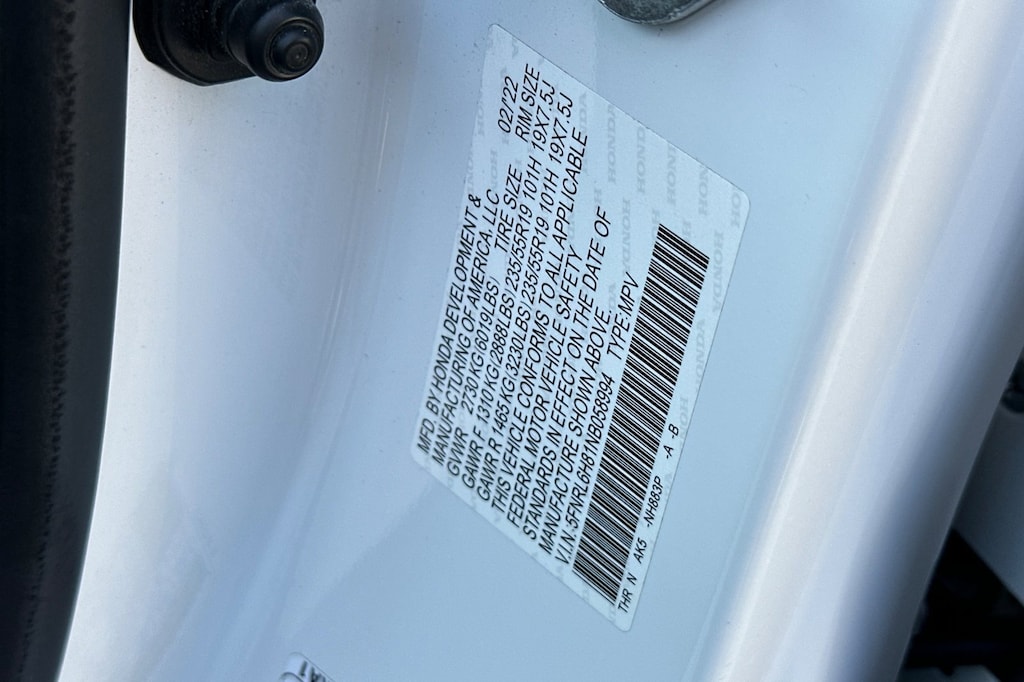 3.61 Axle Ratio, 3rd row seats: split-bench, 4-Wheel Disc Brakes, 7 Speakers, A/V remote: CabinControl, ABS brakes, Adaptive Cruise Control: Adaptive Cruise Control (ACC) with Low-Speed Follow, Air Conditioning, Alloy wheels, AM/FM radio: SiriusXM, Anti-whiplash front head restraints, Apple CarPlay/Android Auto, Auto High-beam Headlights, Auto-dimming Rear-View mirror, Automatic temperature control, Blind Spot Information (BSI) System warning, Brake assist, Bumpers: body-color, CD player, Compass, Delay-off headlights, Driver door bin, Driver vanity mirror, Driver's Seat Mounted Armrest, Dual front impact airbags, Dual front side impact airbags, DVD-Audio, Electronic Stability Control, Emergency communication system: HondaLink, Exterior Parking Camera Rear, Forward collision: Collision Mitigation Braking System (CMBS) + FCW mitigation, Four wheel independent suspension, Front anti-roll bar, Front Bucket Seats, Front dual zone A/C, Front fog lights, Front reading lights, Fully automatic headlights, Garage door transmitter: HomeLink, Headphones, Heated door mirrors, Heated Front Bucket Seats, Heated front seats, Illuminated entry, Knee airbag, Lane departure: Lane Keeping Assist System (LKAS) active, Leather Seat Trim, Leather steering wheel, Low tire pressure warning, Memory seat, Navigation system: Honda Satellite-Linked Navigation System, Occupant sensing airbag, Outside temperature display, Overhead airbag, Overhead console, Panic alarm, Passenger door bin, Passenger seat mounted armrest, Passenger vanity mirror, Power door mirrors, Power driver seat, Power Liftgate, Power moonroof, Power passenger seat, Power steering, Power windows, Radio data system, Radio: 160-Watt AM/FM/HD/SiriusXM Audio System, Rear air conditioning, Rear anti-roll bar, Rear audio controls, Rear reading lights, Rear seat center armrest, Rear window defroster, Rear window wiper, Reclining 3rd row seat, Remote keyless entry, Security system, Speed control, Speed-sensing steering, Speed-Sensitive Wipers, Split folding rear seat, Spoiler, Steering wheel mounted audio controls, Tachometer, Telescoping steering wheel, Tilt steering wheel, Traction control, Trip computer, Turn signal indicator mirrors, Variably intermittent wipers, and Wheels: 19" Machine-Finished Alloy.