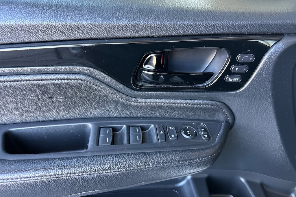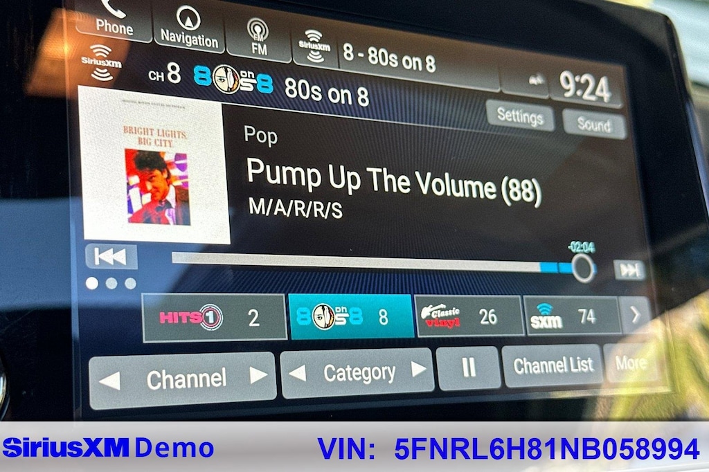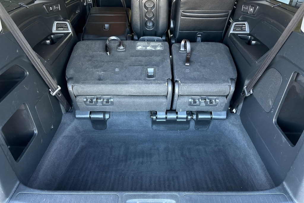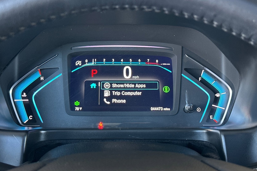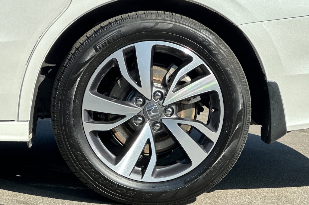 3.61 Axle Ratio, 3rd row seats: split-bench, 4-Wheel Disc Brakes, 7 Speakers, A/V remote: CabinControl, ABS brakes, Adaptive Cruise Control: Adaptive Cruise Control (ACC) with Low-Speed Follow, Air Conditioning, Alloy wheels, AM/FM radio: SiriusXM, Anti-whiplash front head restraints, Apple CarPlay/Android Auto, Auto High-beam Headlights, Auto-dimming Rear-View mirror, Automatic temperature control, Blind Spot Information (BSI) System warning, Brake assist, Bumpers: body-color, CD player, Compass, Delay-off headlights, Driver door bin, Driver vanity mirror, Driver's Seat Mounted Armrest, Dual front impact airbags, Dual front side impact airbags, DVD-Audio, Electronic Stability Control, Emergency communication system: HondaLink, Exterior Parking Camera Rear, Forward collision: Collision Mitigation Braking System (CMBS) + FCW mitigation, Four wheel independent suspension, Front anti-roll bar, Front Bucket Seats, Front dual zone A/C, Front fog lights, Front reading lights, Fully automatic headlights, Garage door transmitter: HomeLink, Headphones, Heated door mirrors, Heated Front Bucket Seats, Heated front seats, Illuminated entry, Knee airbag, Lane departure: Lane Keeping Assist System (LKAS) active, Leather Seat Trim, Leather steering wheel, Low tire pressure warning, Memory seat, Navigation system: Honda Satellite-Linked Navigation System, Occupant sensing airbag, Outside temperature display, Overhead airbag, Overhead console, Panic alarm, Passenger door bin, Passenger seat mounted armrest, Passenger vanity mirror, Power door mirrors, Power driver seat, Power Liftgate, Power moonroof, Power passenger seat, Power steering, Power windows, Radio data system, Radio: 160-Watt AM/FM/HD/SiriusXM Audio System, Rear air conditioning, Rear anti-roll bar, Rear audio controls, Rear reading lights, Rear seat center armrest, Rear window defroster, Rear window wiper, Reclining 3rd row seat, Remote keyless entry, Security system, Speed control, Speed-sensing steering, Speed-Sensitive Wipers, Split folding rear seat, Spoiler, Steering wheel mounted audio controls, Tachometer, Telescoping steering wheel, Tilt steering wheel, Traction control, Trip computer, Turn signal indicator mirrors, Variably intermittent wipers, and Wheels: 19" Machine-Finished Alloy.