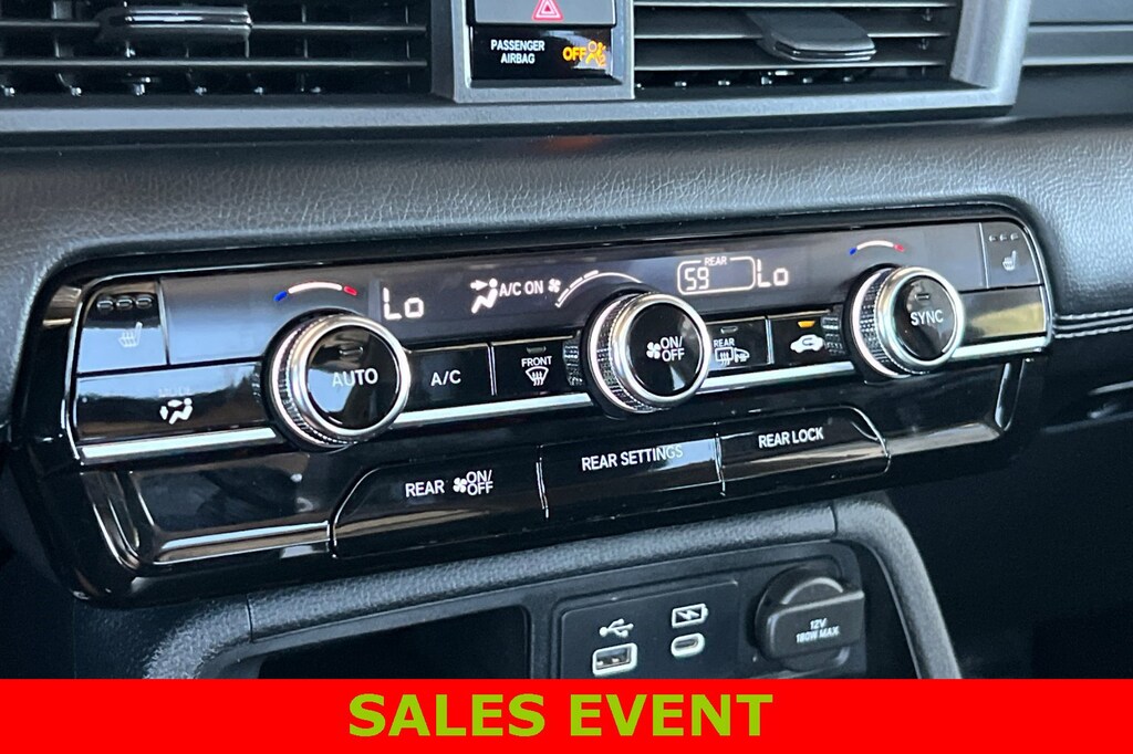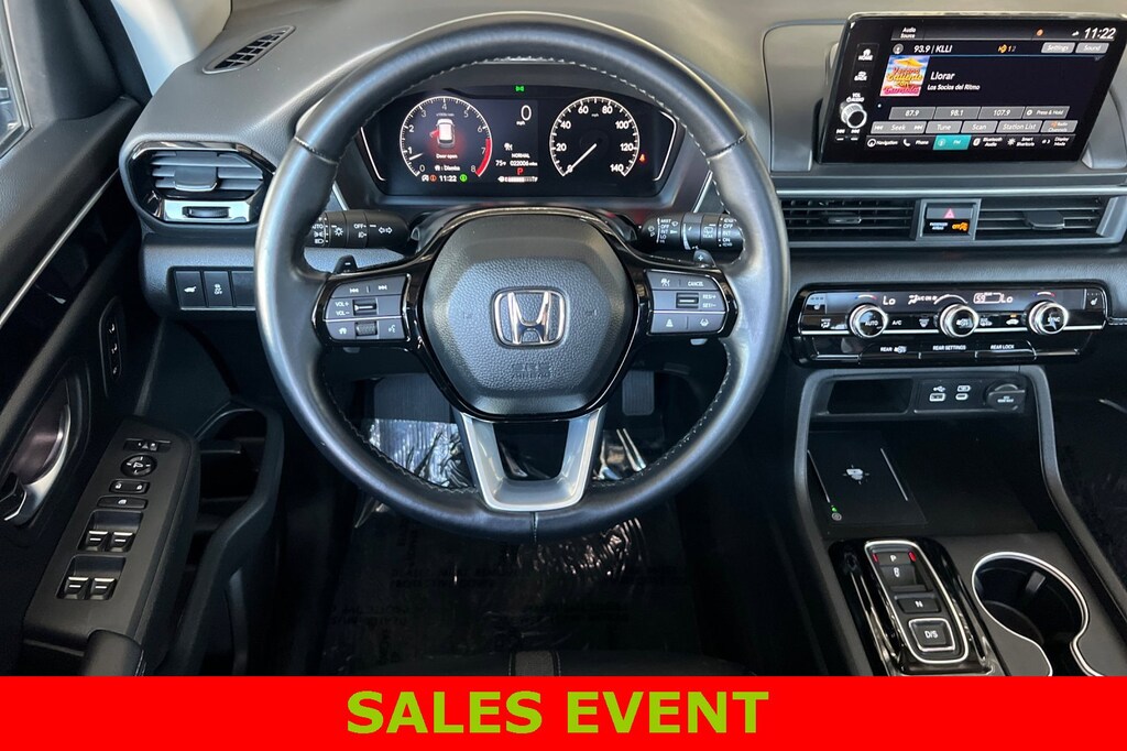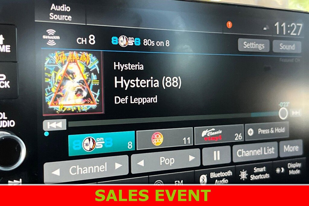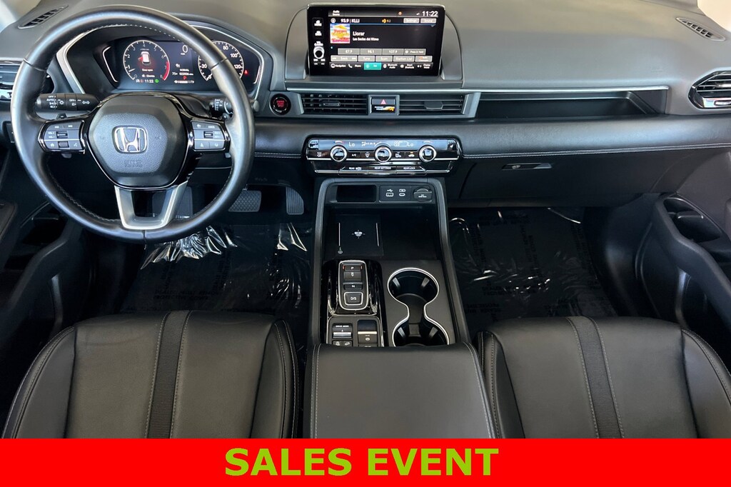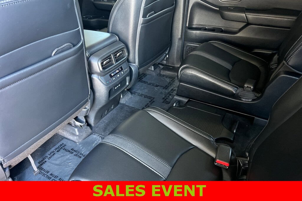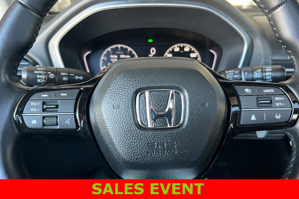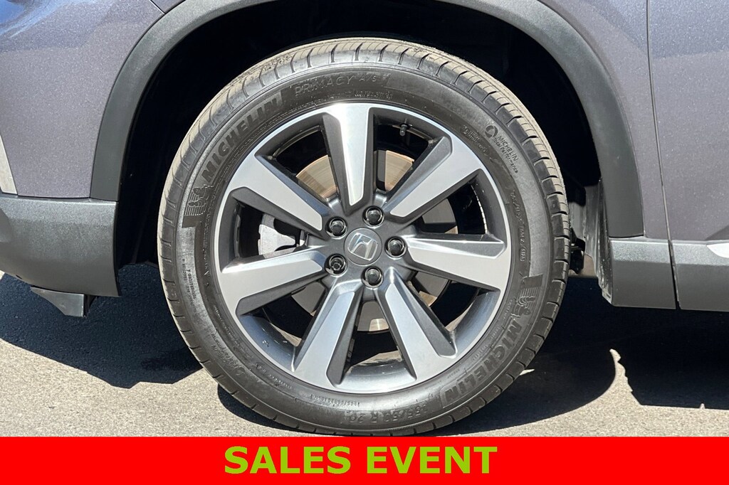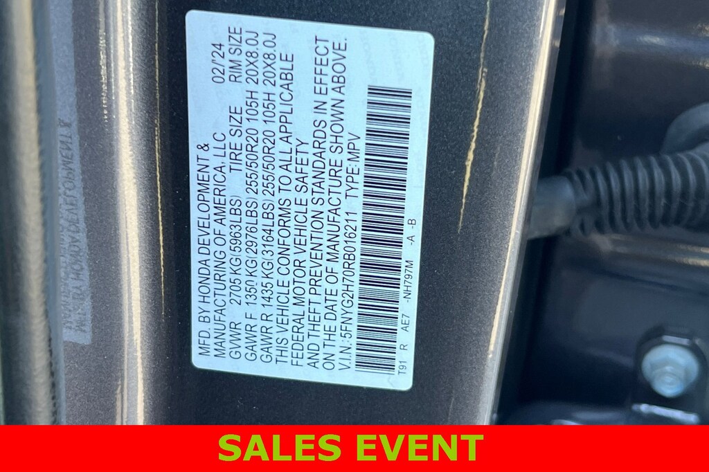 12 Speakers, 3rd row seats: split-bench, 4-Wheel Disc Brakes, ABS brakes, Adaptive Cruise Control: Adaptive Cruise Control (ACC) with Low-Speed Follow, Air Conditioning, Alloy wheels, AM/FM radio: SiriusXM, Apple CarPlay/Android Auto, Auto High-beam Headlights, Auto-dimming Rear-View mirror, Automatic temperature control, Axle Ratio: 4.167, Blind Spot Information (BSI) System warning, Brake assist, Bumpers: body-color, Compass, Delay-off headlights, Driver door bin, Driver vanity mirror, Dual front impact airbags, Dual front side impact airbags, Electronic Stability Control, Emergency communication system: HondaLink, Exterior Parking Camera Rear, Four wheel independent suspension, Front anti-roll bar, Front Bucket Seats, Front Center Armrest, Front dual zone A/C, Front fog lights, Front reading lights, Fully automatic headlights, Garage door transmitter: HomeLink, Heated door mirrors, Heated Front Bucket Seats, Heated front seats, Illuminated entry, Knee airbag, Lane departure: Lane Keeping Assist System (LKAS) active, Leather Seat Trim, Low tire pressure warning, Memory seat, Navigation system: Honda Satellite-Linked Navigation System, Occupant sensing airbag, Outside temperature display, Overhead airbag, Overhead console, Panic alarm, Passenger door bin, Passenger vanity mirror, Power door mirrors, Power driver seat, Power Liftgate, Power moonroof, Power passenger seat, Power steering, Power windows, Radio data system, Radio: BOSE Premium Sound System, Rear air conditioning, Rear anti-roll bar, Rear reading lights, Rear seat center armrest, Rear window defroster, Rear window wiper, Reclining 3rd row seat, Remote keyless entry, Security system, Speed control, Speed-sensing steering, Speed-Sensitive Wipers, Split folding rear seat, Spoiler, Steering wheel mounted audio controls, Tachometer, Telescoping steering wheel, Tilt steering wheel, Traction control, Trip computer, Turn signal indicator mirrors, Variably intermittent wipers, and Wheels: 20" Shark Gray Machine Face w/Blk Lug Nuts.