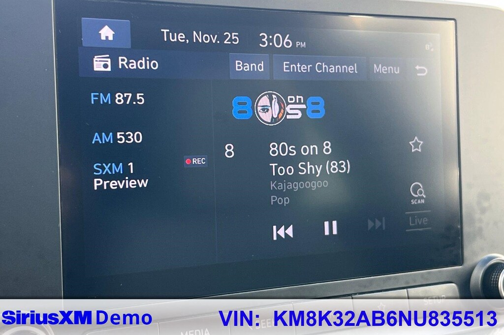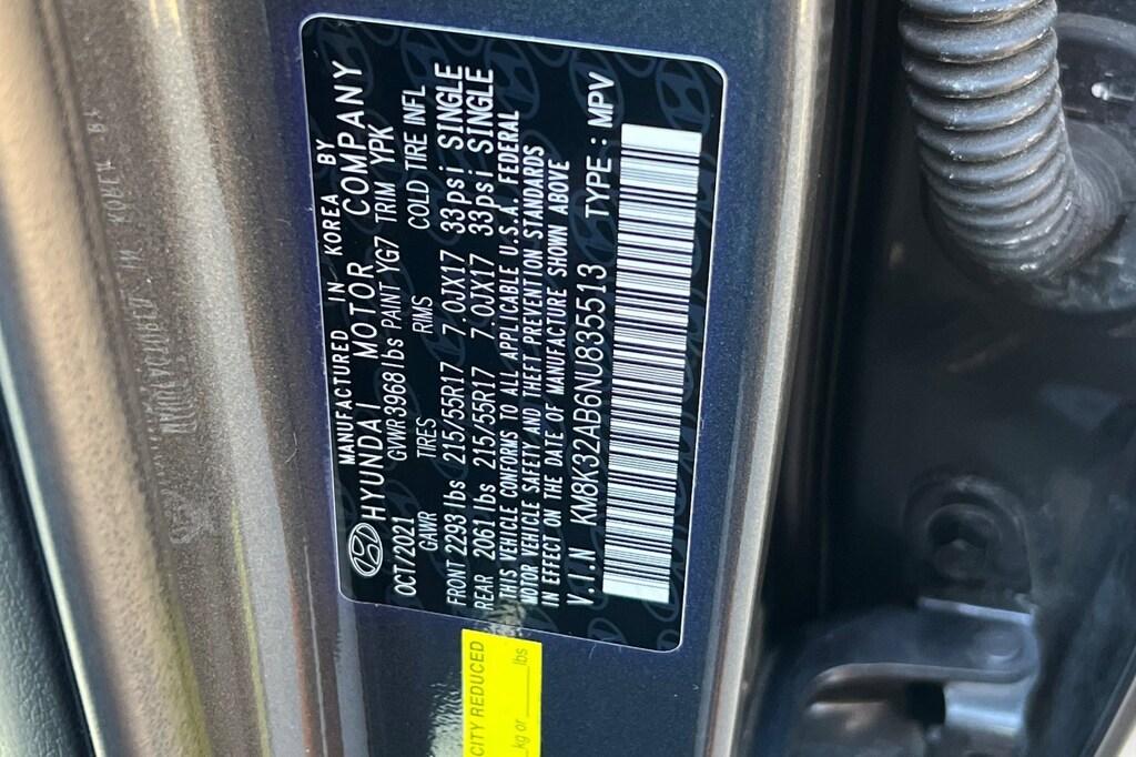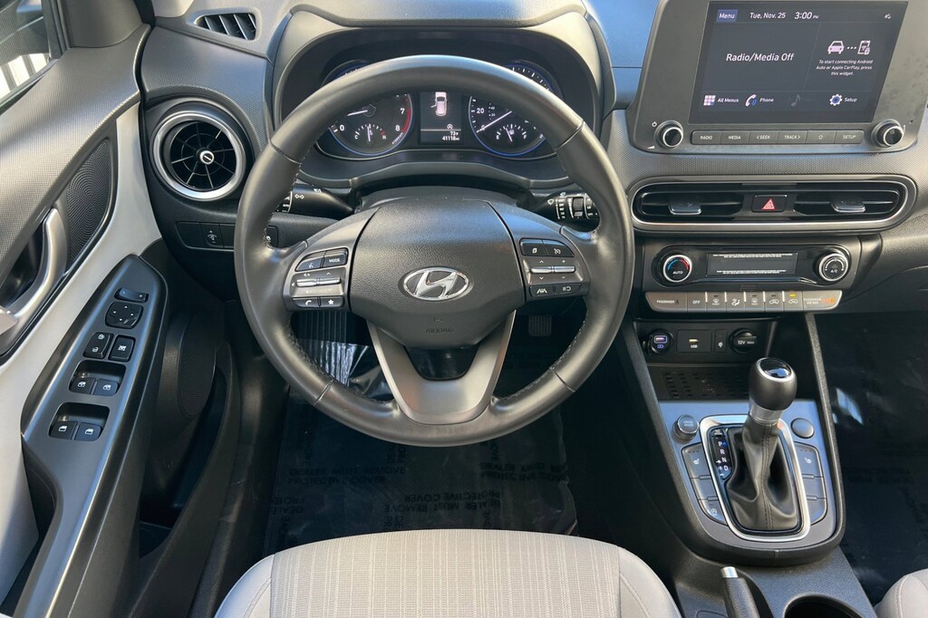 Cargo Package (Cargo Net and Cargo Tray), Convenience Package (Automatic Temperature Control, Heated Front Seats, Hidden Cargo-Area Storage Compartment, Leather-Wrapped Shift Knob, Leather-Wrapped Steering Wheel, NFC Digital Key, Option Group 02, Power Tilt-and-Slide Sunroof, Power Windows w/Front Auto-Down/Up, Premium Dark Grey Body Cladding, and Wireless Device Charging), 4-Wheel Disc Brakes, 5.715 Axle Ratio, 6 Speakers, ABS brakes, Air Conditioning, Alloy wheels, AM/FM radio: SiriusXM, Apple CarPlay & Android Auto, Brake assist, Bumpers: body-color, Carpeted Floor Mats, Cloth Seat Trim, Delay-off headlights, Driver door bin, Driver vanity mirror, Dual front impact airbags, Dual front side impact airbags, Electronic Stability Control, Emergency communication system: Blue Link Connected Car Service (3-year complimentary subscription), Exterior Parking Camera Rear, Front & Rear Mudguards, Front anti-roll bar, Front Bucket Seats, Front Center Armrest, Front reading lights, Front wheel independent suspension, Fully automatic headlights, Heated door mirrors, Illuminated entry, Low tire pressure warning, Occupant sensing airbag, Overhead airbag, Overhead console, Panic alarm, Passenger door bin, Passenger vanity mirror, Power door mirrors, Power steering, Power windows, Radio: AM/FM/HD Radio/SiriusXM Audio System, Rear seat center armrest, Rear window defroster, Rear window wiper, Remote keyless entry, Security system, Speed control, Speed-sensing steering, Split folding rear seat, Spoiler, Steering wheel mounted audio controls, Tachometer, Telescoping steering wheel, Tilt steering wheel, Traction control, Trip computer, Turn signal indicator mirrors, Variably intermittent wipers, and Wheels: 17 x 7.0J Alloy.