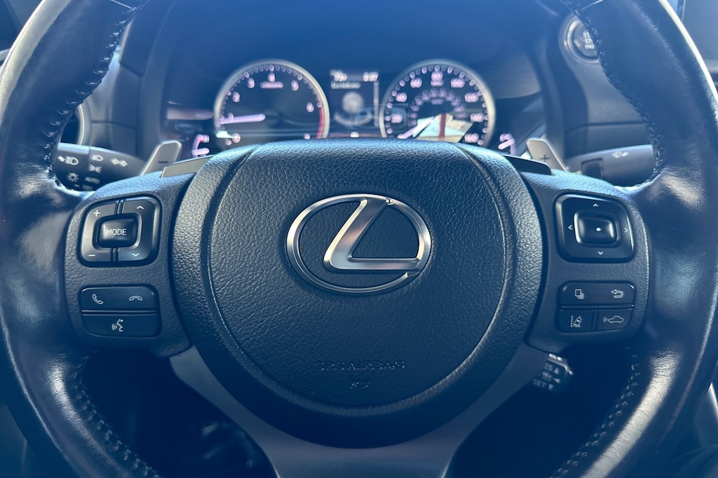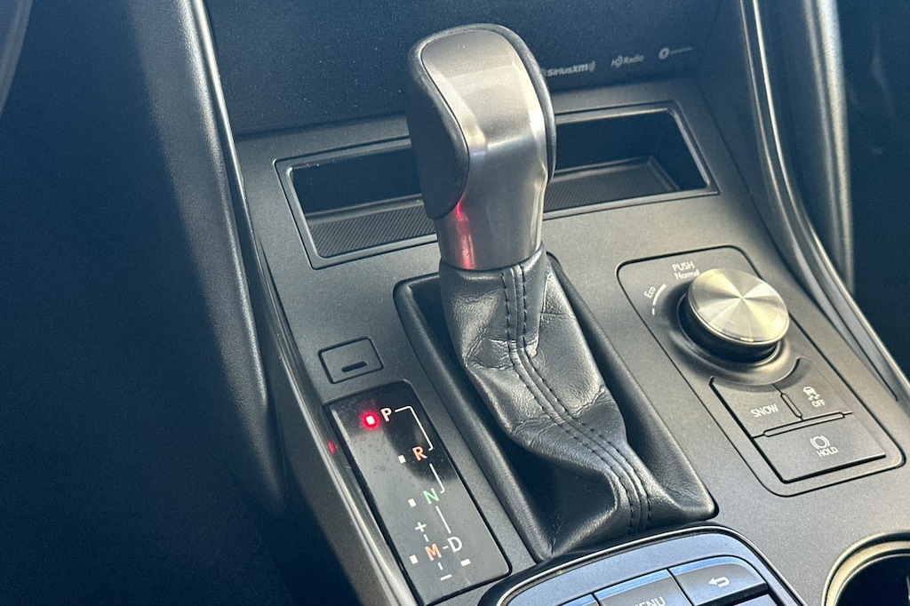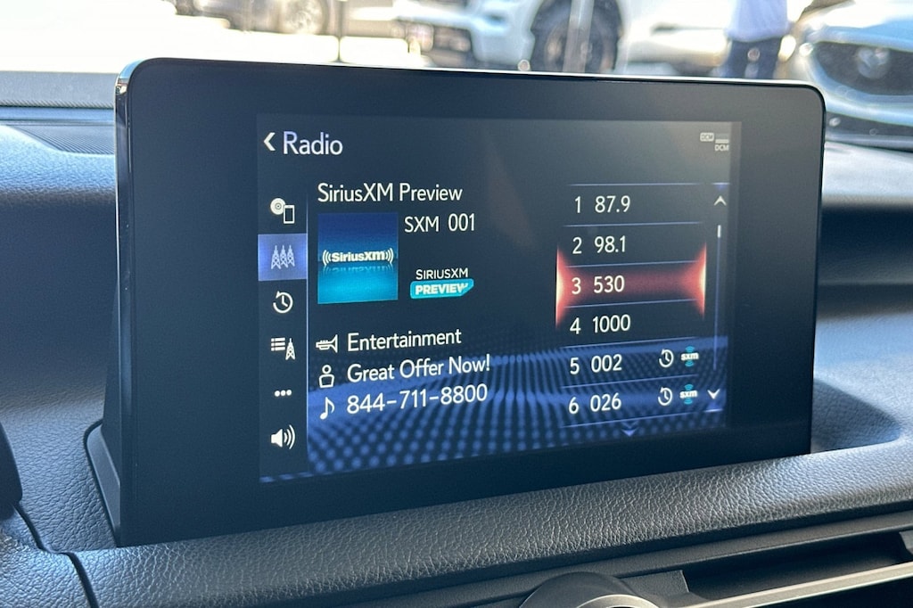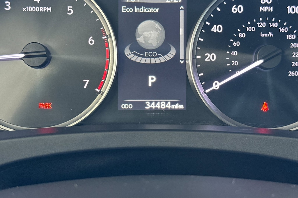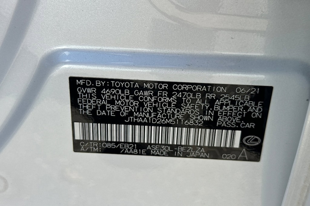 10 Speakers, 4-Wheel Disc Brakes, ABS brakes, Air Conditioning, Alloy wheels, AM/FM radio: SiriusXM, AM/FM/CD Player, Apple CarPlay/Android Auto, Auto High-beam Headlights, Auto-dimming door mirrors, Automatic temperature control, Brake assist, Bumpers: body-color, CD player, Compass, Delay-off headlights, Driver door bin, Driver vanity mirror, Dual front impact airbags, Dual front side impact airbags, Electronic Stability Control, Emergency communication system: Lexus Enform w/Safety Connect, Exterior Parking Camera Rear, Four wheel independent suspension, Front anti-roll bar, Front Bucket Seats, Front Center Armrest, Front dual zone A/C, Front fog lights, Front reading lights, Fully automatic headlights, Garage door transmitter: HomeLink, Heated door mirrors, Illuminated entry, Knee airbag, Leather Shift Knob, Low tire pressure warning, NuLuxe Seat Trim, Occupant sensing airbag, Outside temperature display, Overhead airbag, Overhead console, Panic alarm, Passenger door bin, Passenger vanity mirror, Power door mirrors, Power driver seat, Power passenger seat, Power steering, Power windows, Radio data system, Rain sensing wipers, Rear anti-roll bar, Rear reading lights, Rear seat center armrest, Rear side impact airbag, Rear window defroster, Remote keyless entry, Security system, Speed control, Speed-sensing steering, Speed-Sensitive Wipers, Split folding rear seat, Steering wheel mounted audio controls, Tachometer, Telescoping steering wheel, Tilt steering wheel, Traction control, Trip computer, Turn signal indicator mirrors, Variably intermittent wipers, and Wheels: 18" x 8.5J"