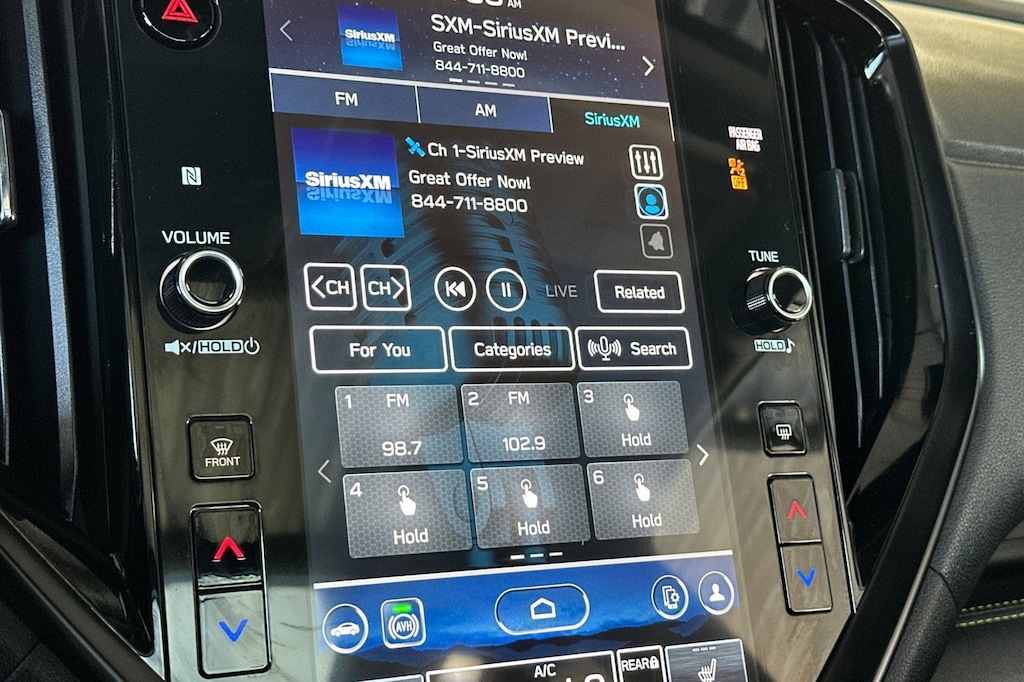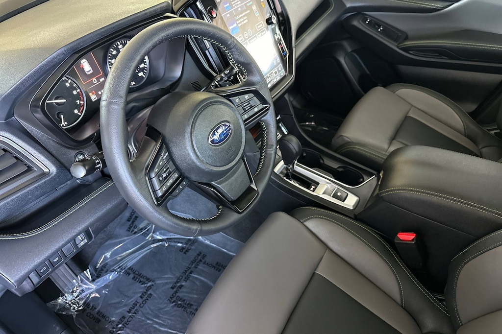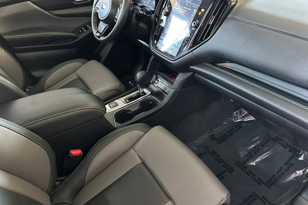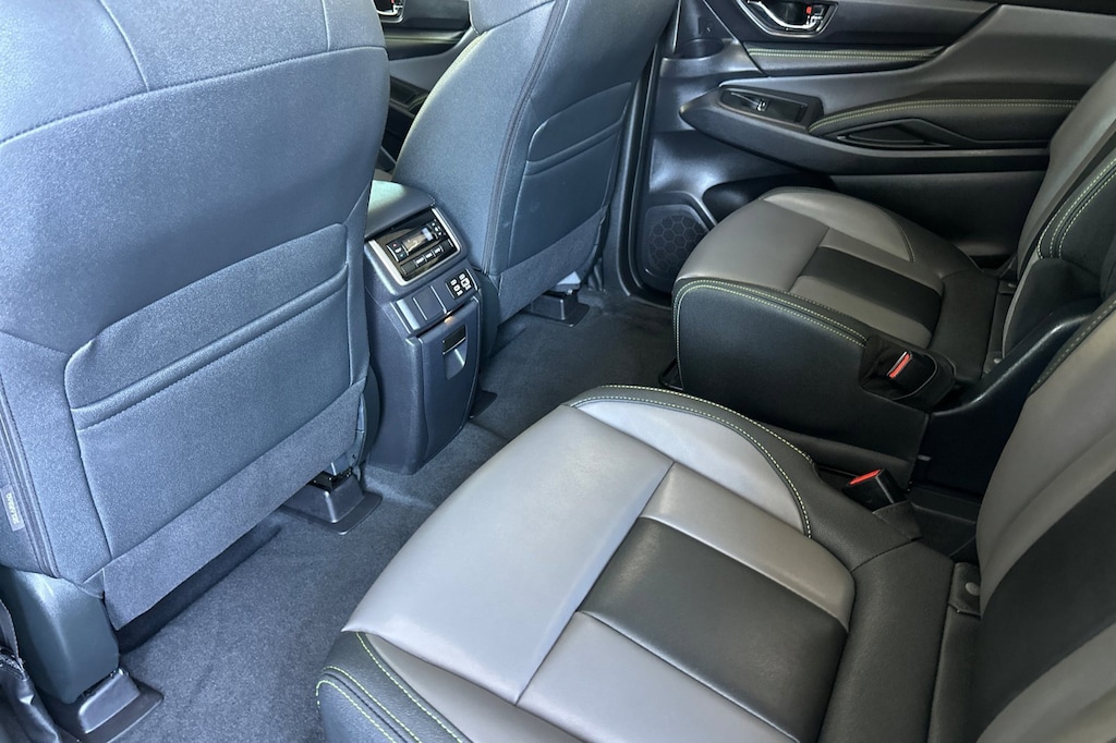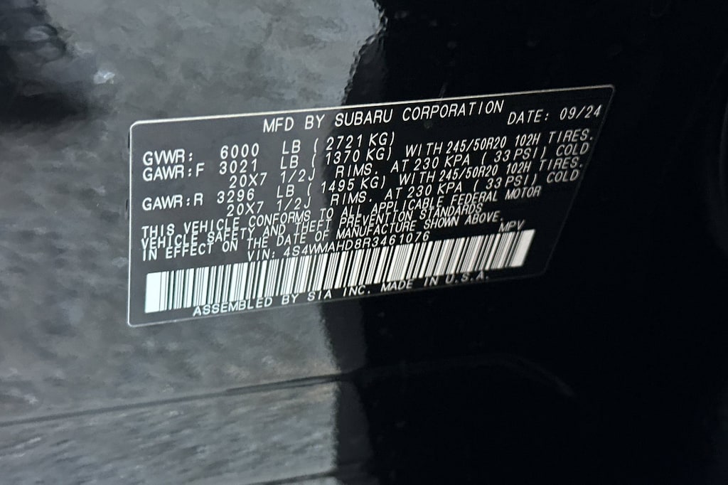 Standard Model, 3rd Row Bench Rear Seatback Protector, 3rd row seats: bench, 4-Wheel Disc Brakes, 6 Speakers, ABS brakes, Air Conditioning, All-Weather Floor Liners, Alloy wheels, AM/FM radio: SiriusXM, Auto High-beam Headlights, Auto-Dimming Exterior Mirror w/Approach Light, Auto-dimming Rear-View mirror, Automatic temperature control, Axle Ratio: 4.44, Brake assist, Bumpers: body-color, Cargo Net, Compass, Delay-off headlights, Driver door bin, Driver vanity mirror, Dual front impact airbags, Dual front side impact airbags, Electronic Stability Control, Emergency communication system: STARLINK Safety and Security (Subscription Required), Exterior Parking Camera Rear, Four wheel independent suspension, Front anti-roll bar, Front Bucket Seats, Front Center Armrest, Front dual zone A/C, Front fog lights, Front reading lights, Fully automatic headlights, Garage door transmitter: HomeLink, Heated door mirrors, Heated Front Bucket Seats, Heated front seats, Heated steering wheel, Illuminated entry, Knee airbag, Leather Shift Knob, Leather steering wheel, LED Upgrade, Low tire pressure warning, Occupant sensing airbag, Outside temperature display, Overhead airbag, Overhead console, Panic alarm, Passenger door bin, Passenger vanity mirror, Power door mirrors, Power driver seat, Power Liftgate, Power moonroof, Power steering, Power windows, Radio data system, Radio: Subaru STARLINK 11.6" Multimedia Plus System, Rear air conditioning, Rear anti-roll bar, Rear reading lights, Rear window defroster, Rear window wiper, Reclining 3rd row seat, Remote keyless entry, Security system, Speed control, Speed-sensing steering, Split folding rear seat, Spoiler, STARLINK/Apple CarPlay/Android Auto, StarTex Upholstery, Steering wheel mounted audio controls, Tachometer, Telescoping steering wheel, Tilt steering wheel, Traction control, Trip computer, Turn signal indicator mirrors, Variably intermittent wipers, Wheels: 20" x 7.5 J Aluminum Alloy w/Black Finish, and Wireless Charger.