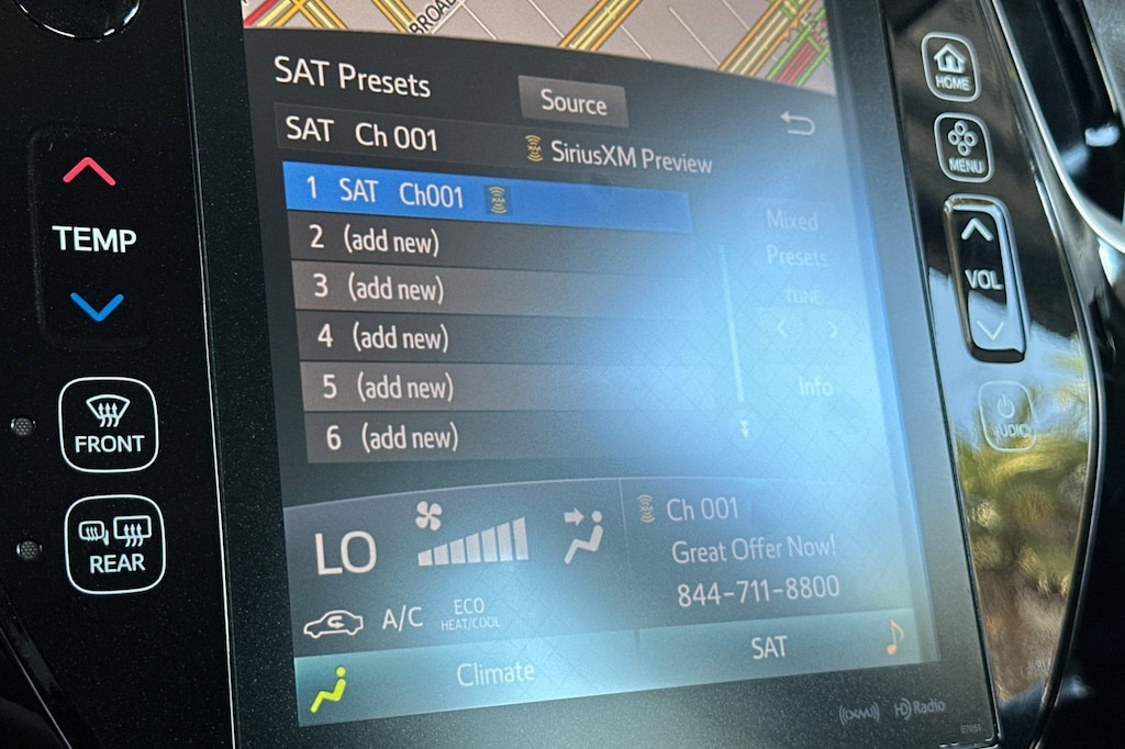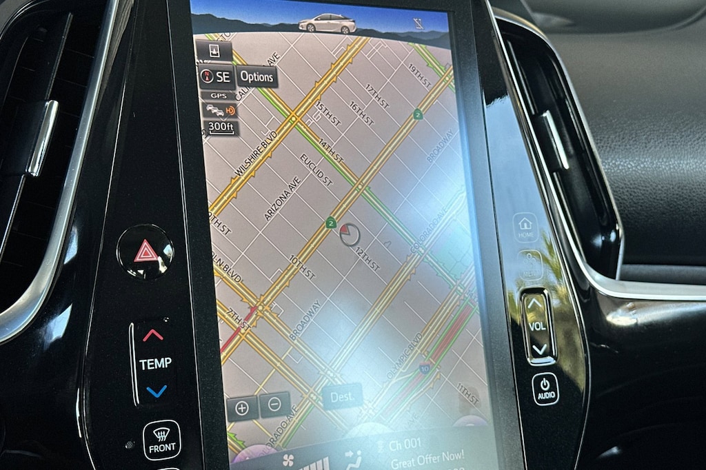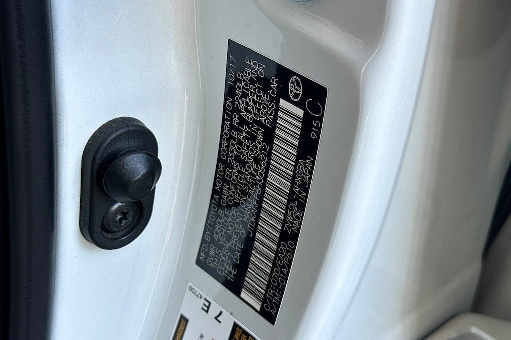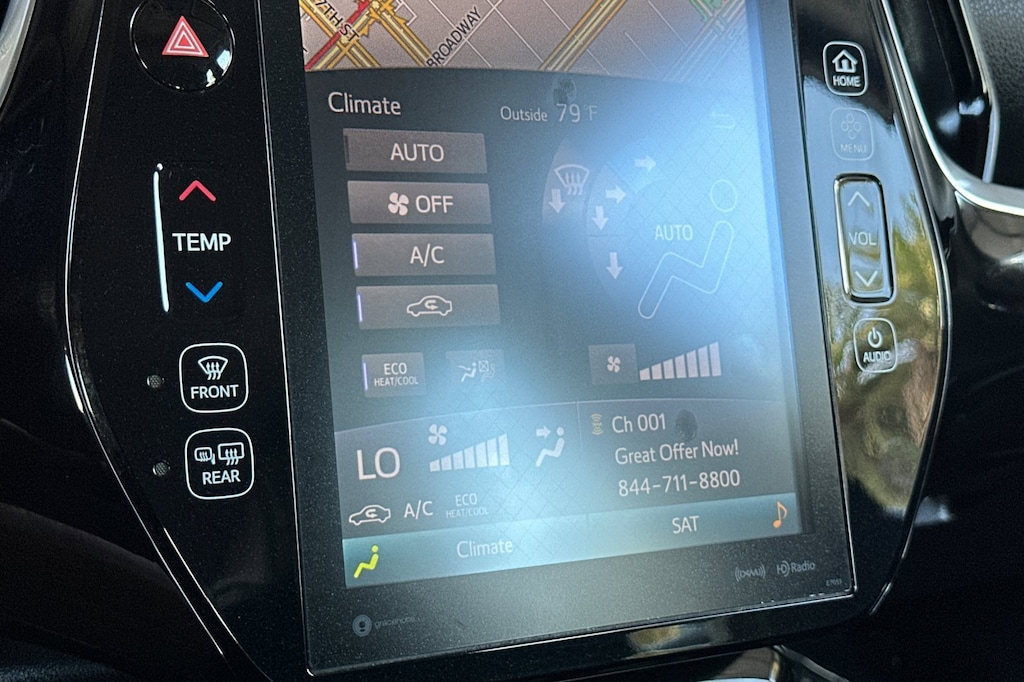 4-Wheel Disc Brakes, ABS brakes, Air Conditioning, Alloy wheels, AM/FM radio: SiriusXM, Auto High-beam Headlights, Automatic temperature control, Brake assist, Bumpers: body-color, Delay-off headlights, Driver door bin, Driver vanity mirror, Dual front impact airbags, Dual front side impact airbags, Electronic Stability Control, Entune App Suite, Exterior Parking Camera Rear, Four wheel independent suspension, Front anti-roll bar, Front Bucket Seats, Front Center Armrest, Front reading lights, Heated door mirrors, Heated Front Bucket Seats, Heated front seats, Illuminated entry, Knee airbag, Low tire pressure warning, Navigation System, Occupant sensing airbag, Outside temperature display, Overhead airbag, Overhead console, Panic alarm, Passenger door bin, Passenger vanity mirror, Power door mirrors, Power steering, Power windows, Rear anti-roll bar, Rear seat center armrest, Rear window defroster, Remote keyless entry, Speed control, Split folding rear seat, Steering wheel mounted audio controls, Telescoping steering wheel, Tilt steering wheel, Traction control, Trip computer, Variably intermittent wipers, and Wheels: 15" x 6.5J 5-Spoke Aluminum Alloy.