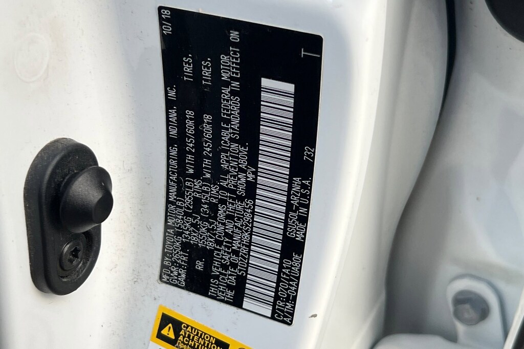 3.003 Axle Ratio, 3rd row seats: split-bench, 4-Wheel Disc Brakes, 6 Speakers, ABS brakes, Air Conditioning, Alloy wheels, AM/FM radio: SiriusXM, Auto High-beam Headlights, Automatic temperature control, Brake assist, Bumpers: body-color, CD player, Delay-off headlights, Driver door bin, Driver vanity mirror, Dual front impact airbags, Dual front side impact airbags, Electronic Stability Control, Exterior Parking Camera Rear, Fabric Seat Trim w/Softex, Four wheel independent suspension, Front anti-roll bar, Front Bucket Seats, Front Center Armrest, Front dual zone A/C, Front fog lights, Front reading lights, Fully automatic headlights, Heated door mirrors, Illuminated entry, Knee airbag, Leather Shift Knob, Low tire pressure warning, Occupant sensing airbag, Outside temperature display, Overhead airbag, Overhead console, Panic alarm, Passenger door bin, Passenger vanity mirror, Power door mirrors, Power driver seat, Power Liftgate, Power steering, Power windows, Radio: Entune Audio Plus w/Connected Navigation, Rear air conditioning, Rear anti-roll bar, Rear reading lights, Rear seat center armrest, Rear window defroster, Rear window wiper, Reclining 3rd row seat, Remote keyless entry, Satellite Radio, Speed control, Speed-sensing steering, Split folding rear seat, Spoiler, Steering wheel mounted audio controls, Tachometer, Telescoping steering wheel, Tilt steering wheel, Traction control, Trip computer, Turn signal indicator mirrors, Variably intermittent wipers, and Wheels: 18" Split 5-Spoke Machined-Face Alloy.